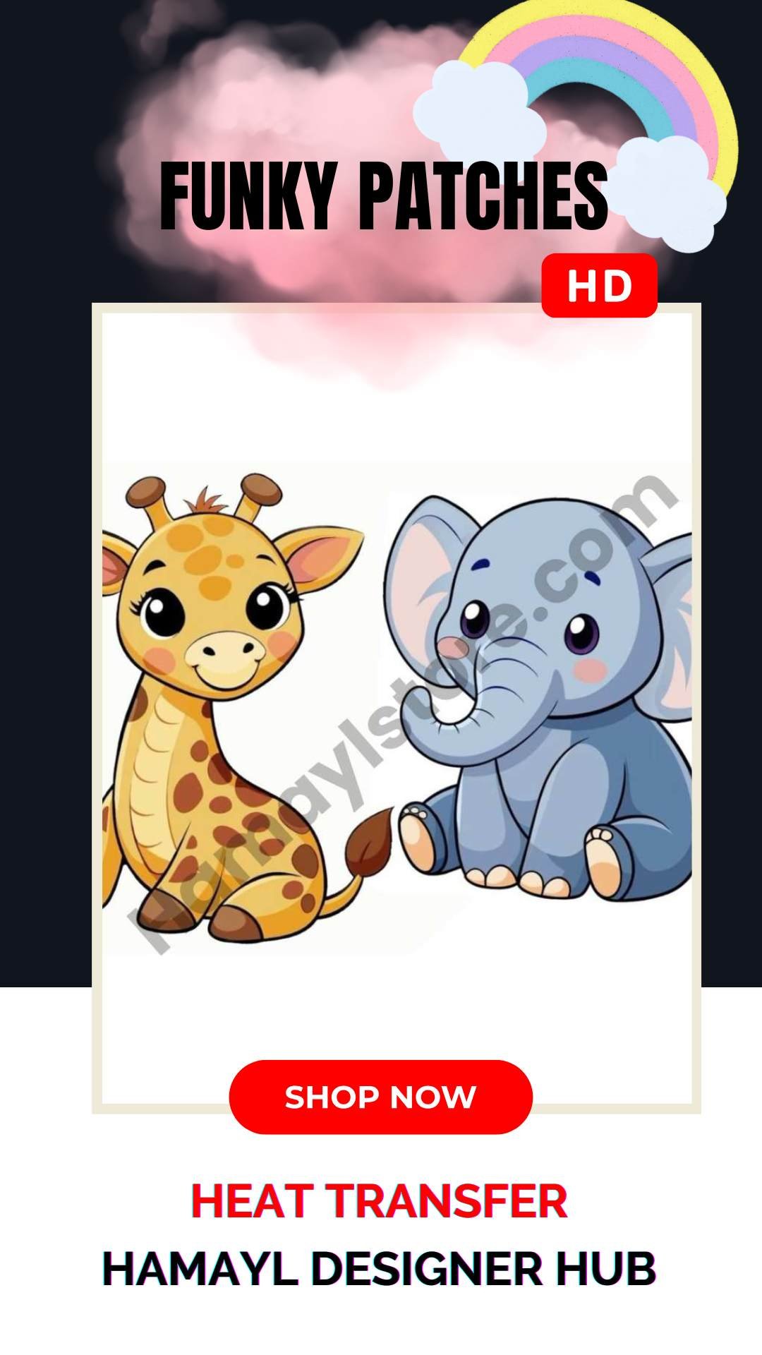The Baby Giraffe & Elephant Funky Patch is a premium quality Iron On Patches in Pakistan design specially created for kids clothing, boutique outfits and custom fashion wear. Featuring a cute giraffe and elephant duo, this high-definition heat transfer patch adds playful charm to any outfit.