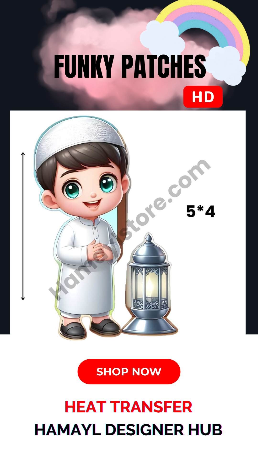 The Cute Islamic Boy Lantern Patch 5×4 Inches is a beautifully designed Iron On Patches in Pakistan product featuring a charming Islamic-themed boy standing beside a lantern. This high-definition heat transfer patch is ideal for festive outfits, kidswear and boutique customization projects.