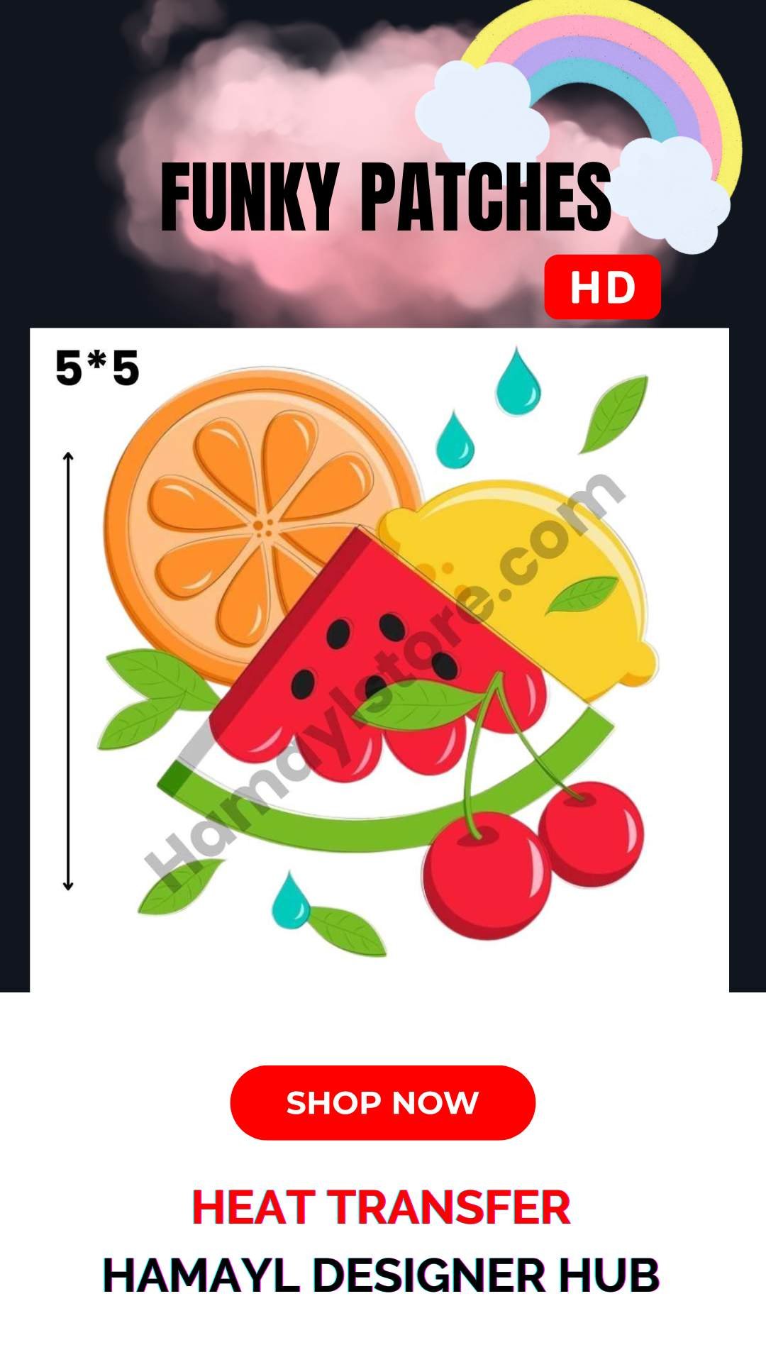 The Fresh Fruit Mix Patch 5×5 Inches is a vibrant and colorful addition to our premium collection of Iron On Patches in Pakistan. Featuring a refreshing combination of orange slice, lemon, watermelon, cherries, and green leaves, this HD heat transfer patch is perfect for summer-themed outfits and kids fashion customization.