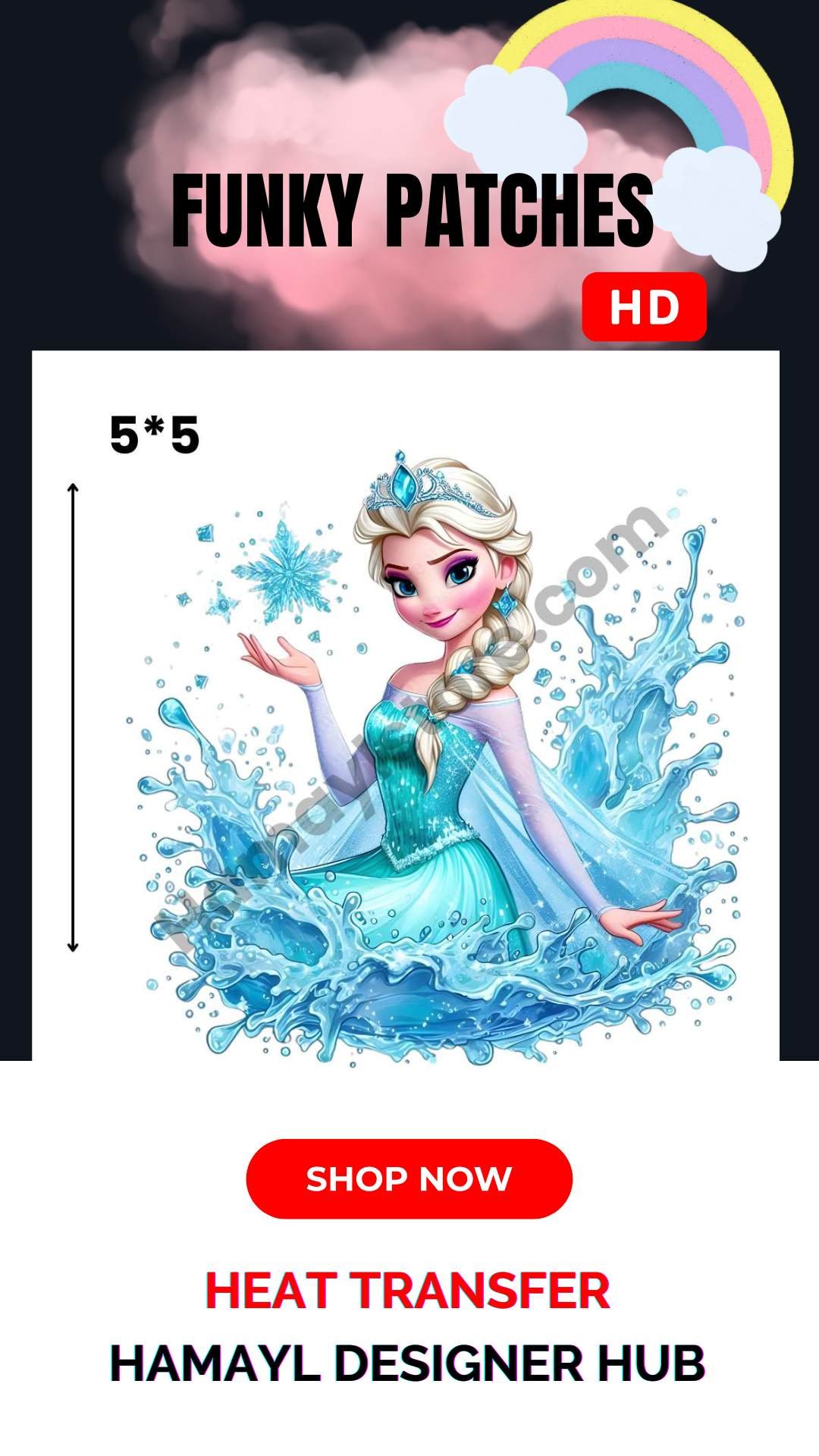 The Ice Queen Splash Patch 5×5 Inches is a premium quality design from our best-selling collection of Iron On Patches in Pakistan. Featuring a magical ice princess artwork with water splash detailing in vibrant HD colors, this heat transfer patch is perfect for girls’ dresses, winter hoodies, birthday outfits, and boutique fashion collections.