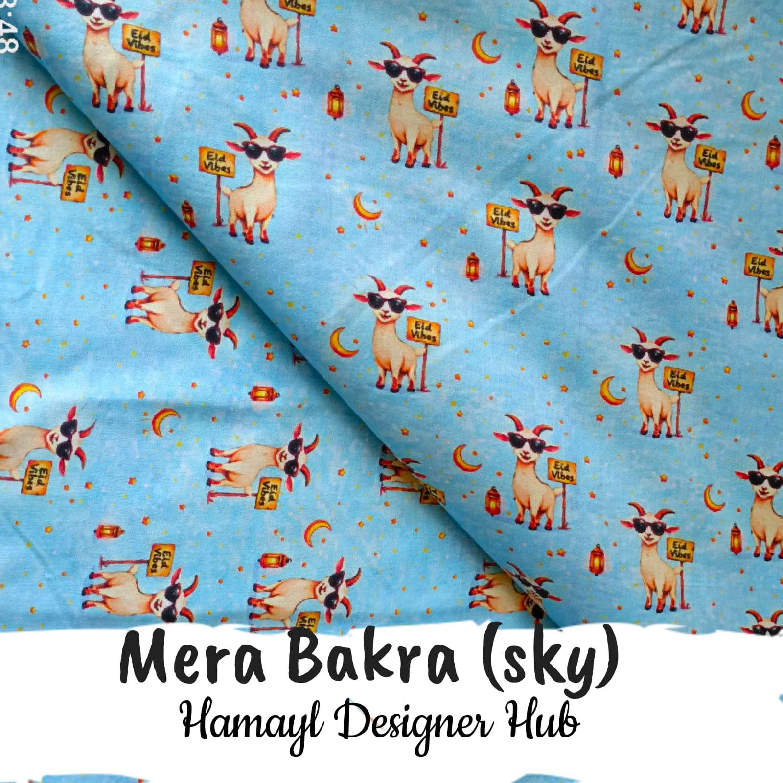 Mera Bakra White – Funky Digital Lawn – Hamayl Designer Hub is a clean and vibrant fabric designed especially for Eid ul Azha and Festive Lawn 2026. This design features cute goats with “Eid Vibes” elements, gifts, moons, and festive icons on a fresh white base.