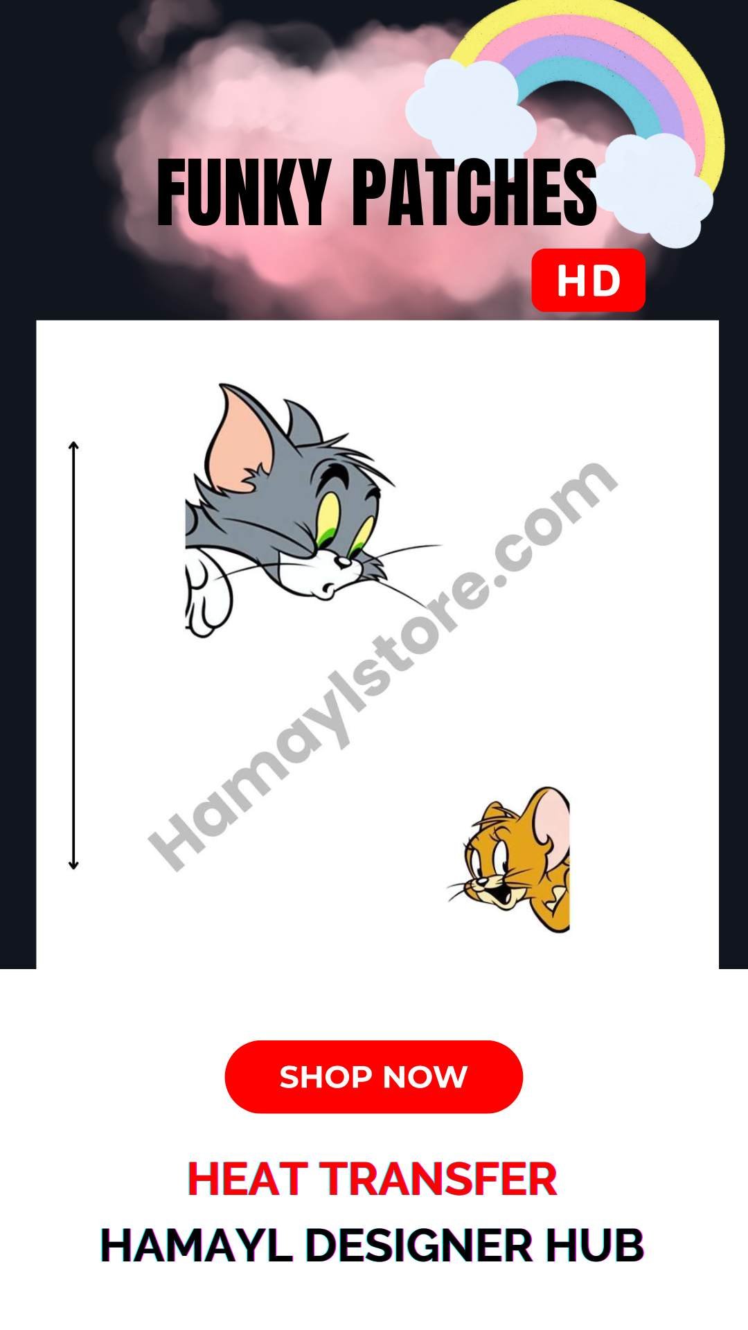 The Peekaboo Cat & Mouse Patch 6×5 Inches is a trendy and playful Iron On Patches in Pakistan design featuring a cute cat and mouse peeking from opposite sides. This high-definition heat transfer patch is ideal for kids clothing, funky outfits and boutique customization.