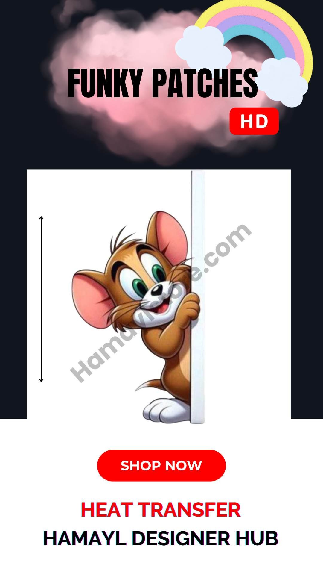 The Peekaboo Mouse Cartoon Patch 6×5 Inches is a high-quality Iron On Patches in Pakistan design featuring a cute mouse peeking from the side. This premium HD heat transfer patch is perfect for kids clothing, cartoon-themed outfits and boutique customization projects.