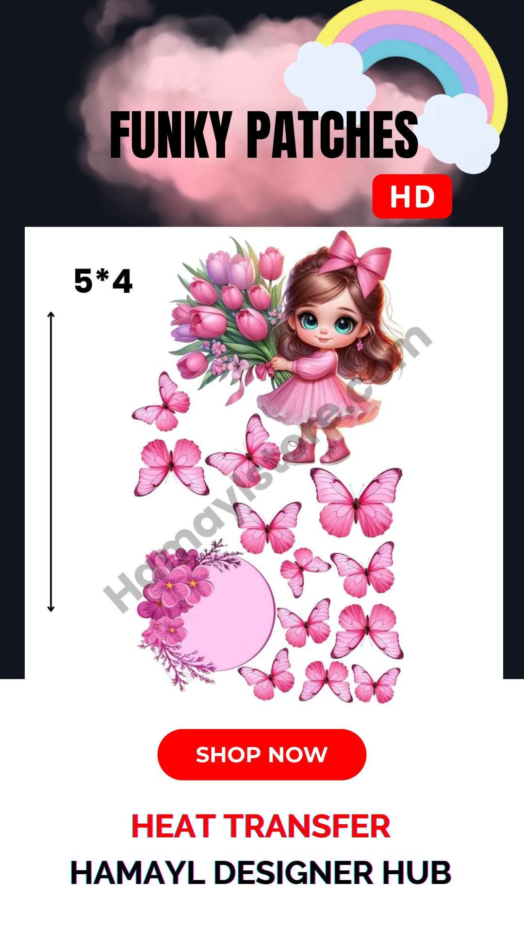 The Pink Butterfly Girl Floral Patch 5×4 Inches is a beautiful and elegant design from our premium Iron On Patches in Pakistan collection. Featuring a cute girl holding pink tulips surrounded by delicate butterflies, this high-definition heat transfer patch is perfect for girls outfits, boutique styling and creative customization.