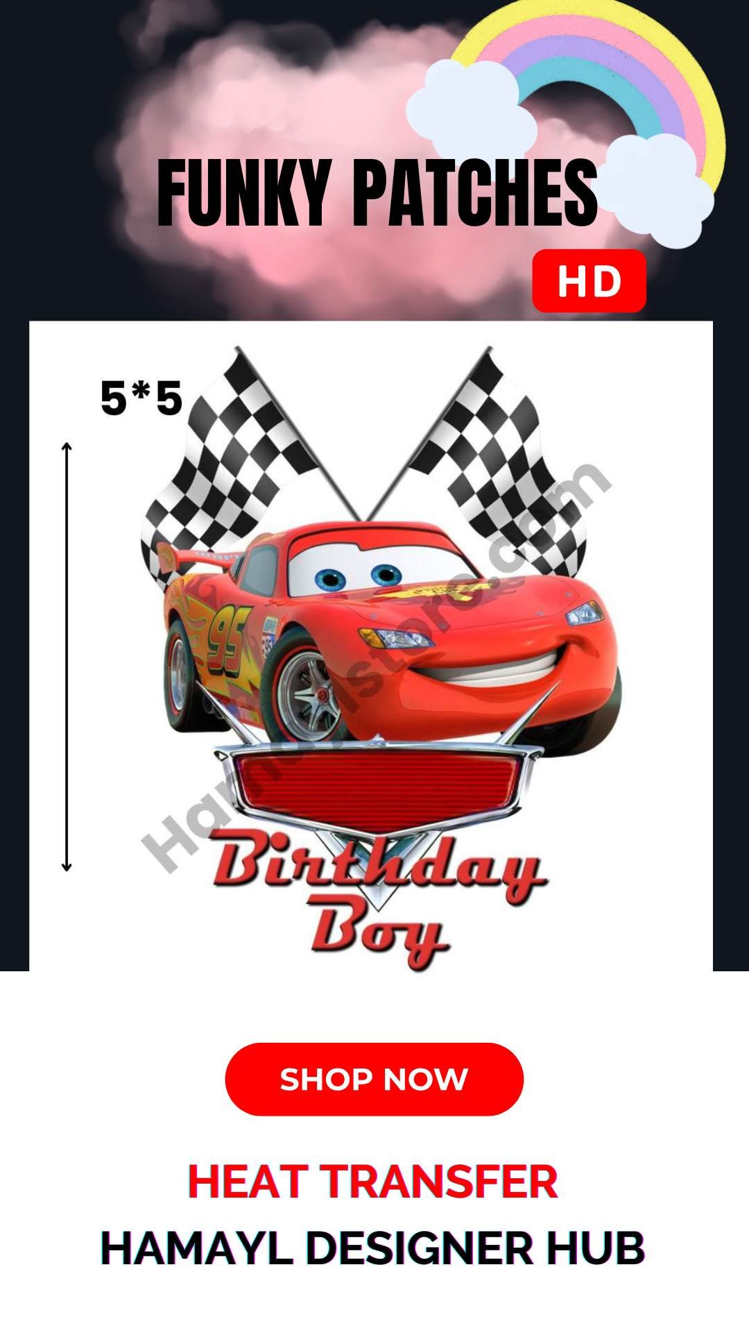The Racing Car Birthday Boy Patch 5×5 Inches is a high-definition design from our premium collection of Iron On Patches in Pakistan. Featuring a vibrant red racing car with checkered flags and “Birthday Boy” theme text, this patch is perfect for kids birthday shirts, party outfits, and customized celebration wear.