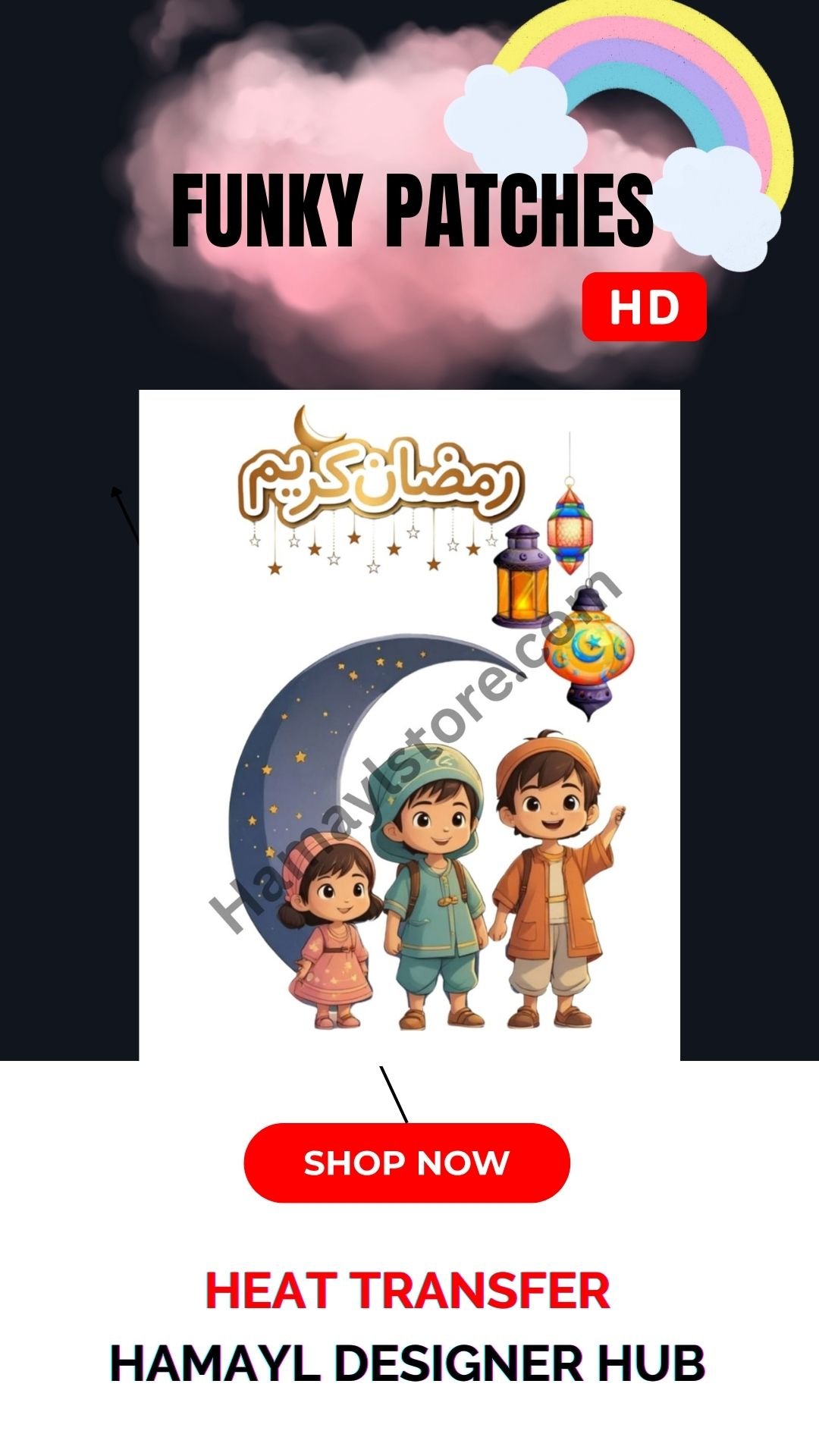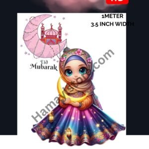 The Ramadan Kareem Kids Moon Patch 5×4 Inches is a beautiful Islamic festive design featuring three cute kids standing under a crescent moon with hanging lanterns and elegant Ramadan Kareem calligraphy. This premium Iron On Patches in Pakistan is specially designed for Ramadan outfits, kids Islamic wear, and boutique festive collections.