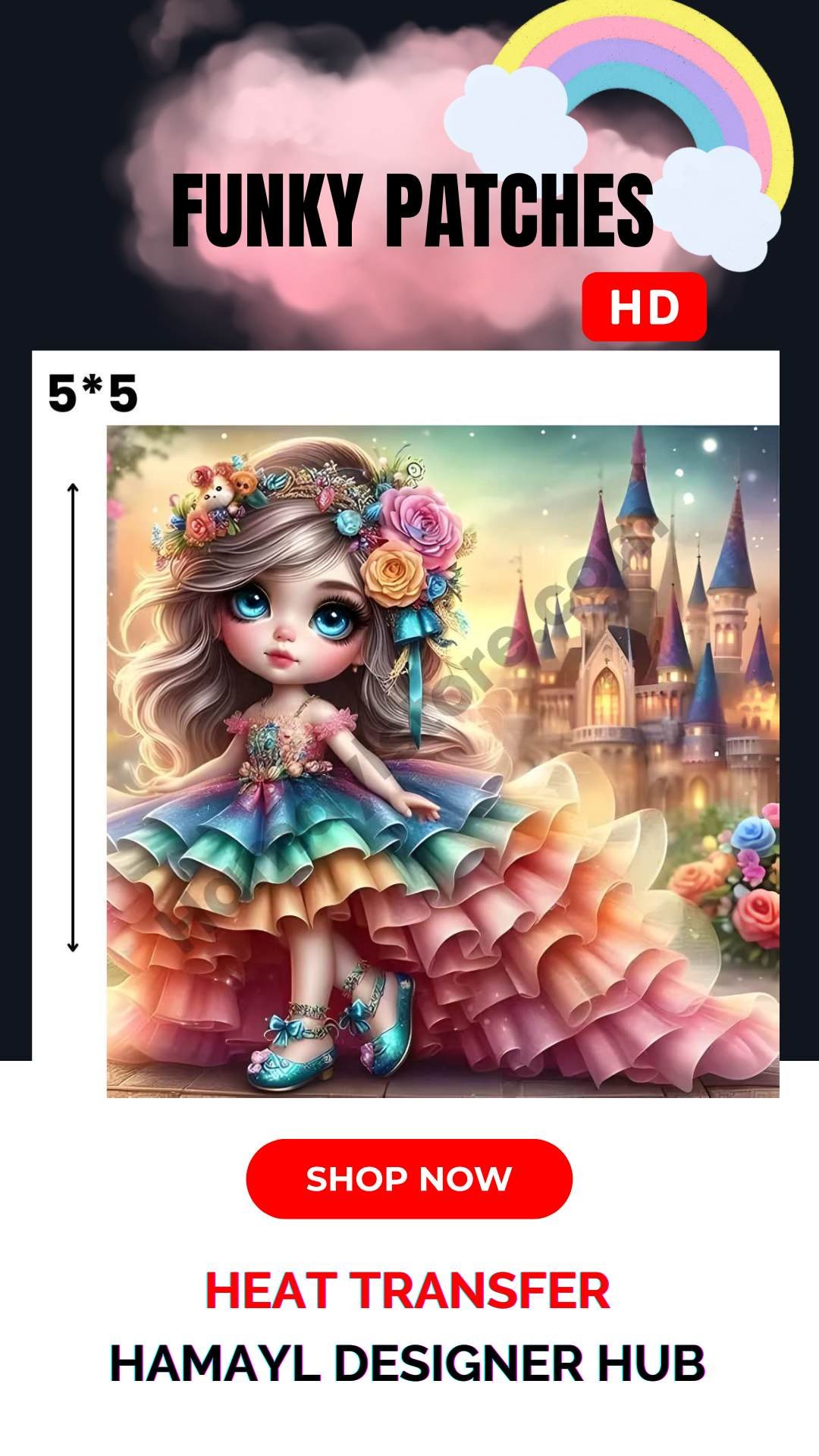 The Royal Rainbow Princess Patch 5×5 Inches is a premium magical design from our exclusive collection of Iron On Patches in Pakistan. Featuring a beautiful big-eyed princess wearing a multi-layer rainbow gown with a royal castle background, this HD heat transfer patch is perfect for birthday dresses, party outfits, boutique frocks, and winter hoodies.