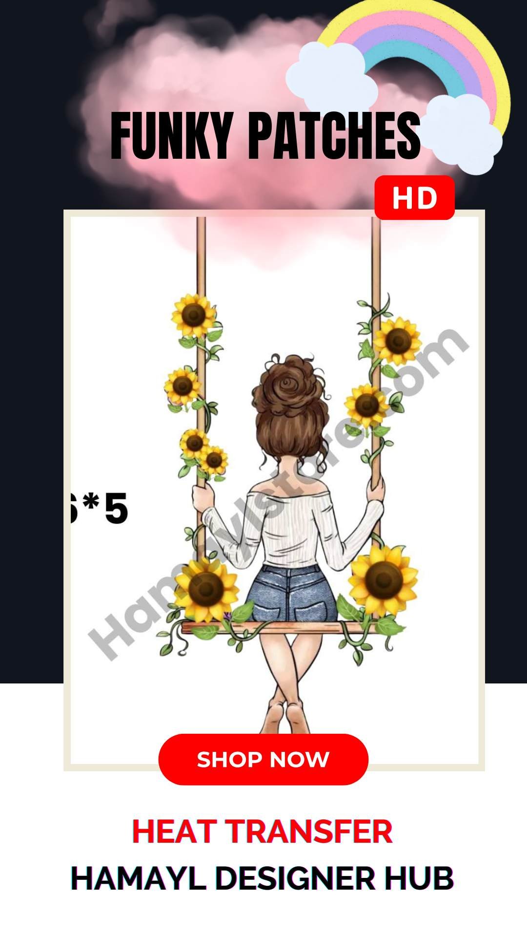 The Sunflower Girl Swing Patch 6×5 Inches is a beautifully designed Iron On Patches in Pakistan product that adds elegance and charm to kidswear, casual outfits and boutique dresses. Featuring a girl sitting on a sunflower swing, this high-definition heat transfer patch is perfect for trendy customization.